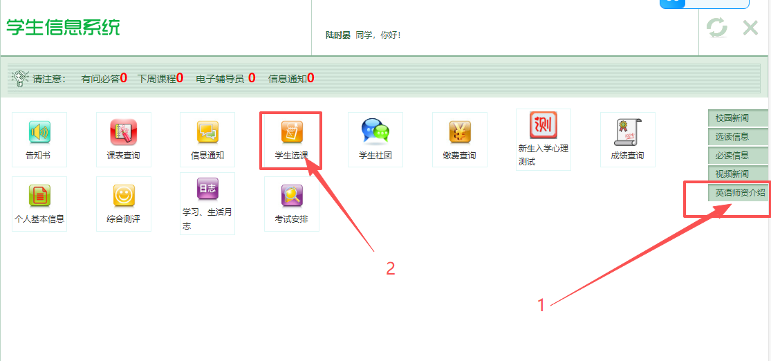 6.在選課前,可點(diǎn)擊“英語師資介紹”欄目,了解任課老師相關(guān)情況,然后點(diǎn)擊“學(xué)生選課”圖標(biāo),開始選課