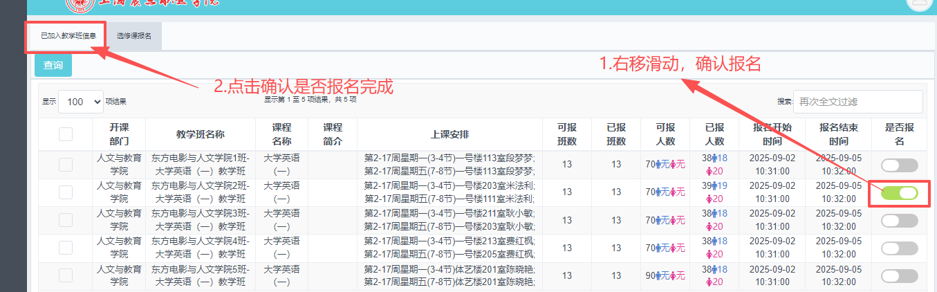 8.查看可報名教學班信息,選擇報名的教學班,右移滑動確認報名(注意:每門課程限報名一個教學班),報名后再點擊“已加入教學班信息”