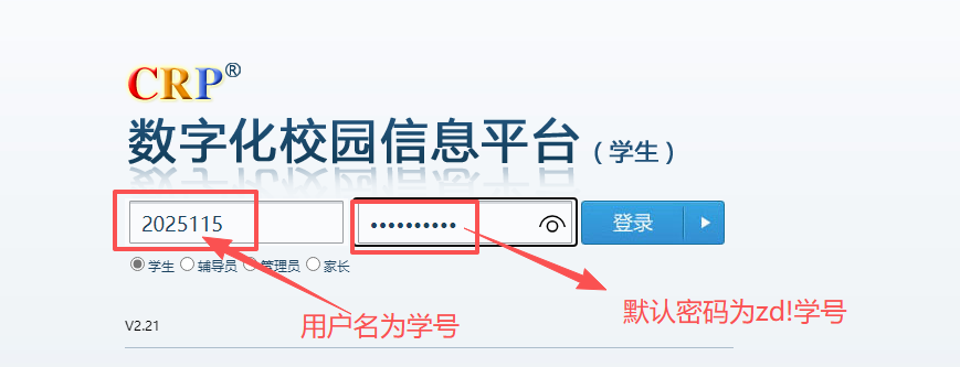 5.輸入用戶名(用戶名為學號)及密碼(默認密碼為zd!學號,如學號為250001則默認密碼為zd!250001)