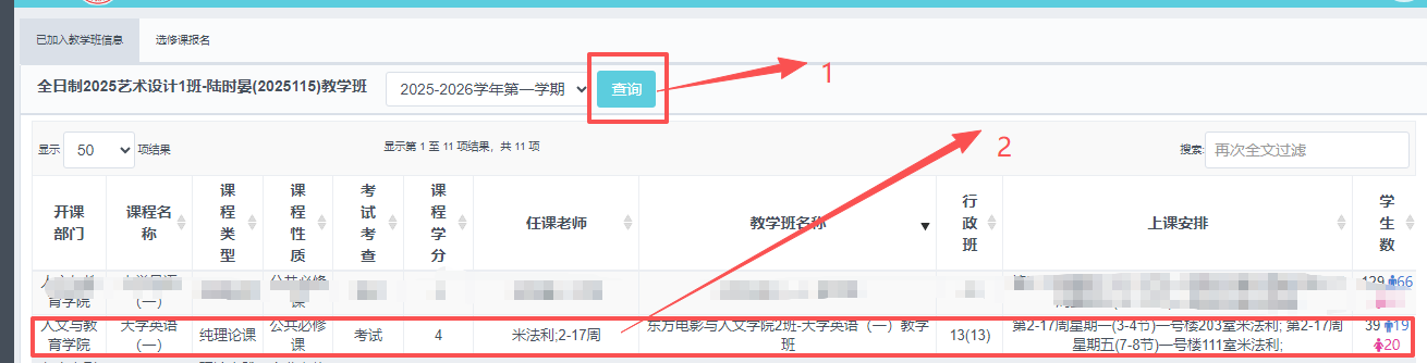 9.點擊“查詢”按鈕,確認是否已經(jīng)加入教學班