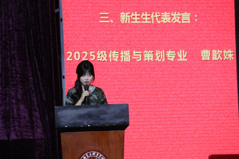 2025級(jí)傳播與策劃專業(yè)曹歆姝同學(xué)代表全體新生發(fā)言,表達(dá)了對(duì)未來的憧憬、對(duì)大學(xué)生活的期待和刻苦努力的決心,表示將不負(fù)眾望,為學(xué)院爭(zhēng)光添彩。