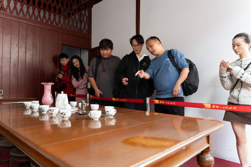 紀(jì)念館展廳內(nèi),從泛黃的《新青年》雜志、第一版《共產(chǎn)黨宣言》中文全譯本,到會議場景的逼真復(fù)原,再到運(yùn)用多媒體技術(shù)再現(xiàn)的“開天辟地大事變”歷史時刻……每一件文物都是一部鮮活的歷史教科書,每一段影像都是一曲激昂的英雄贊歌。智能工程學(xué)院的師生們或駐足凝視,或低聲交流,或認(rèn)真記錄,完全沉浸在那段先驅(qū)者們?yōu)閷で缶葒胬矶舷虑笏鞯膷槑V歲月里。