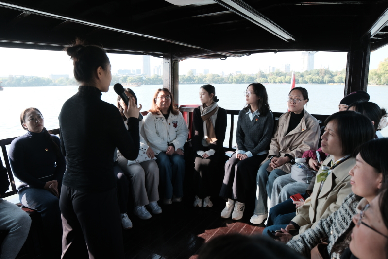 當(dāng)日,黨員同志們乘坐Y701紅色專列奔赴嘉興,在會(huì)景園碼頭登船遠(yuǎn)眺。在船上,教師黨支部書(shū)記高敏老師以“南湖的回響”為題,帶來(lái)了一場(chǎng)簡(jiǎn)短而深刻的微黨課。她結(jié)合黨史故事與新時(shí)代使命,生動(dòng)闡釋了“開(kāi)天辟地、敢為人先的首創(chuàng)精神,堅(jiān)定理想、百折不撓的奮斗精神,立黨為公、忠誠(chéng)為民的奉獻(xiàn)精神”的核心內(nèi)涵。全體黨員圍坐船頭,沉浸式參與“水上課堂”,接受了一次深刻的思想淬煉。