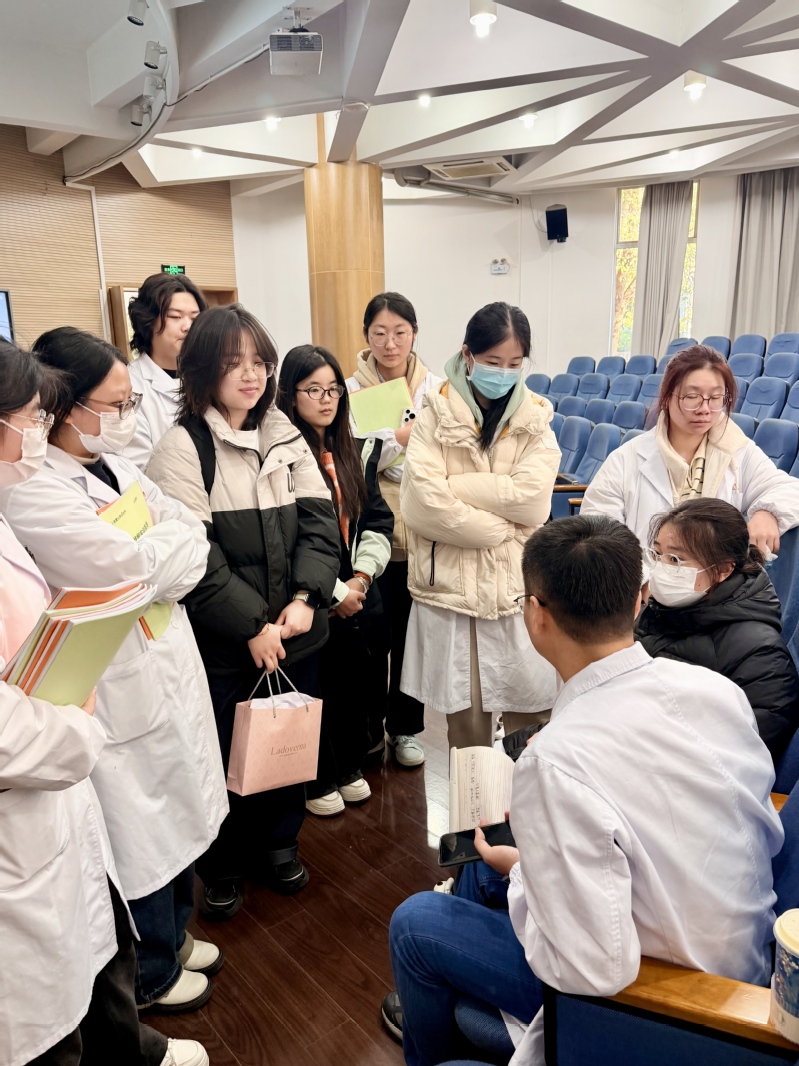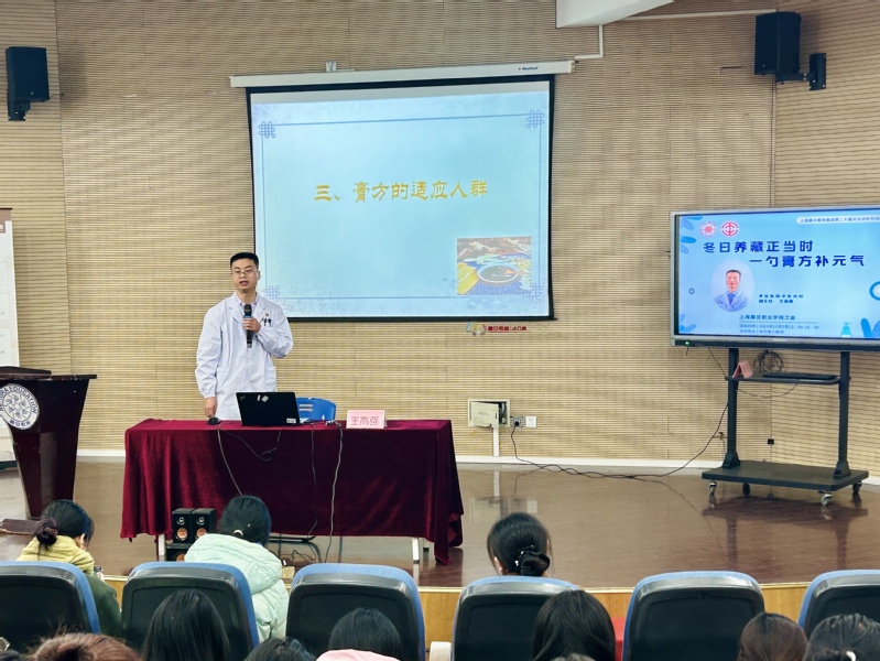 王高強副主任深耕中醫(yī)內(nèi)科臨床工作多年,在膏方調(diào)理與養(yǎng)生保健領域有著豐富的理論積淀和實踐經(jīng)驗。講座中,他結(jié)合中醫(yī)“天人相應”和“冬藏”理論,從膏方的歷史淵源、組方原則、炮制工藝等核心內(nèi)容切入,系統(tǒng)講解了膏方在冬日養(yǎng)生中的獨特優(yōu)勢。講座內(nèi)容兼具理論深度與實踐價值,學生們專注聆聽、認真記錄,并就膏方制備流程、藥材炮制要點等專業(yè)問題與王主任探討交流。