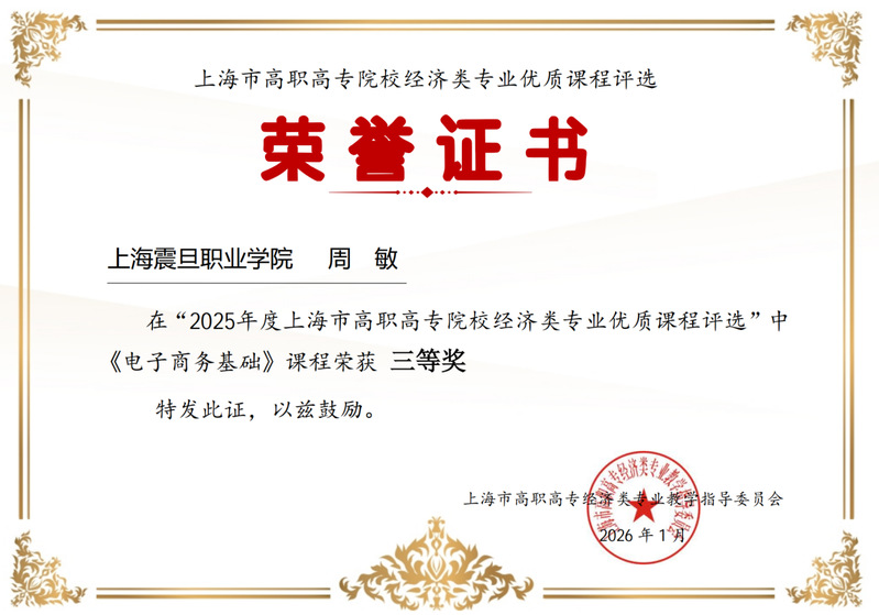 近日,2025年上海市高職高專(zhuān)經(jīng)濟(jì)類(lèi)專(zhuān)業(yè)優(yōu)質(zhì)課程評(píng)審會(huì)順利舉行。我校經(jīng)濟(jì)管理學(xué)院周敏老師團(tuán)隊(duì)的《電子商務(wù)基礎(chǔ)》課程憑借課程設(shè)計(jì)的創(chuàng)新性、思政教育的融合度與實(shí)踐教學(xué)的實(shí)效性,榮獲市級(jí)優(yōu)質(zhì)課程三等獎(jiǎng)。